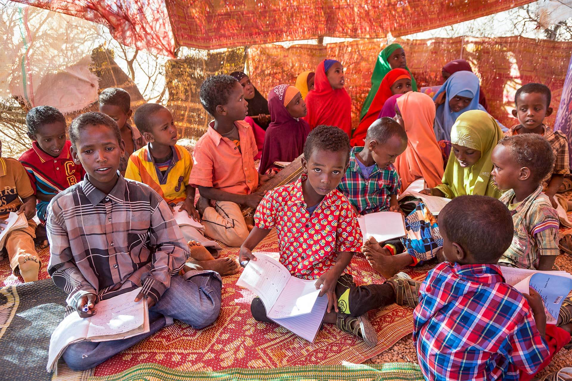 Besprechung (Ole Hengelbrock (links, Cap Anamur Koordinator), Halima Mohamed (links vorne, Director des National Institute of Public Health and Tropical Medicine) mit den Geflüchteten im IDP-Camp Caynabo (Geflüchtete im eigenen Land). Hier leben 600 Familien.